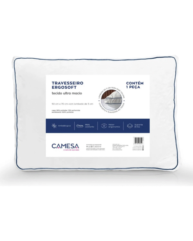 O Travesseiro Ergosoft da Camesa foi desenvolvido para oferecer noites de sono mais aconchegantes e tranquilas. Produzido em tecido polimicro ultra macio e com enchimento de poliéster, proporciona toque suave e apoio confortável para cabeça e pescoço, contribuindo para um descanso de qualidade.