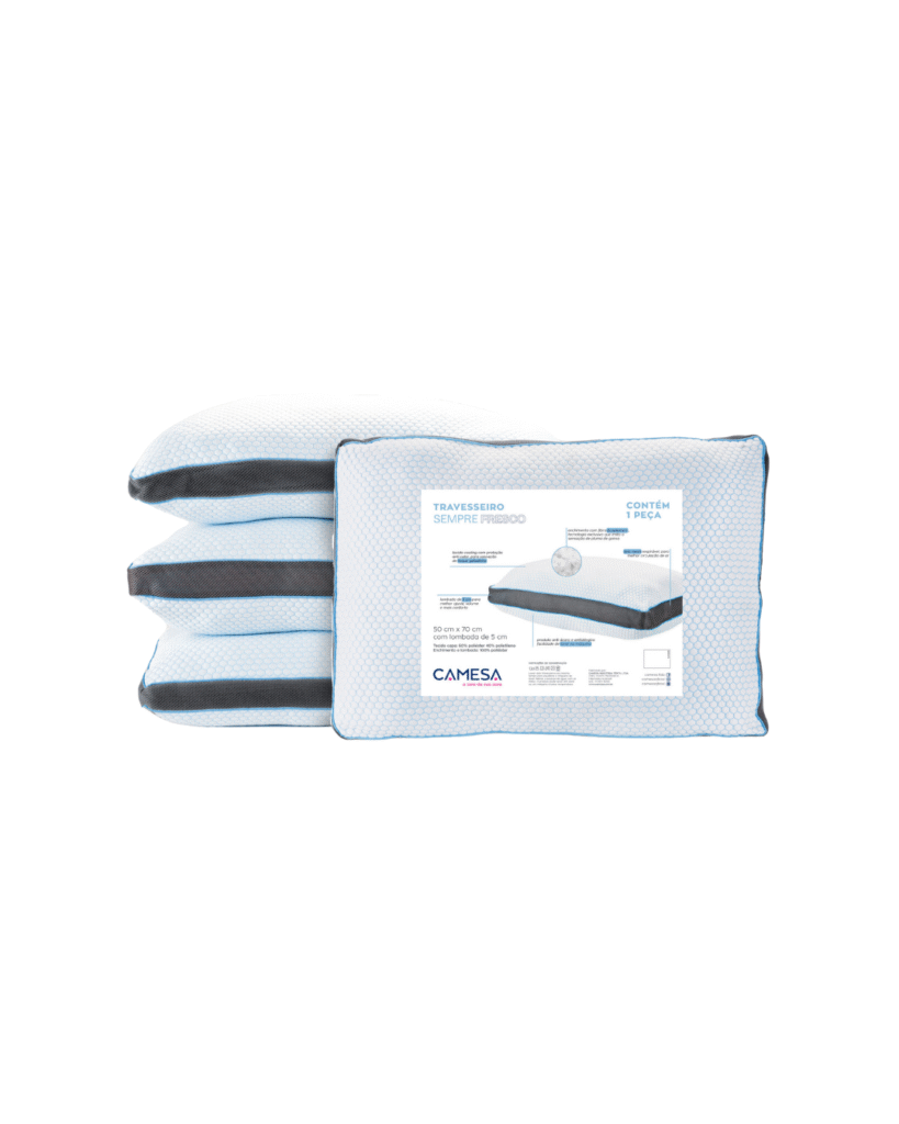 Travesseiro Sempre Fresco Camesa, com tecido respirável e enchimento em tecnologia Ecopluma. Macio, hipoalergênico e antiácaro, garante frescor, suporte ideal e bem-estar durante o sono.