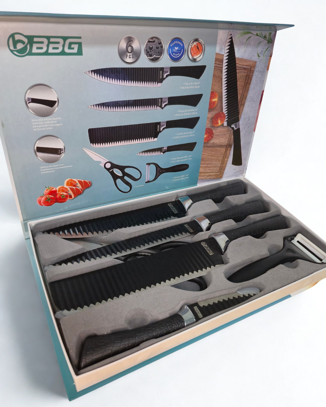 Transforme sua rotina na cozinha com o Kit de Facas BBG! Com um design moderno e funcional, este conjunto oferece tudo o que você precisa para preparar receitas com agilidade e precisão.