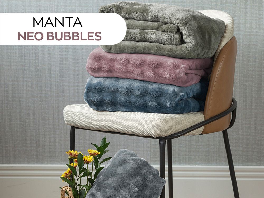 Manta Bubbles Neo 130 x 150 cm da Camesa, feita em 100% poliéster com toque macio, leve e aconchegante. Com textura em relevo e gramatura de 300 g/m², é ideal para decorar e aquecer com conforto.